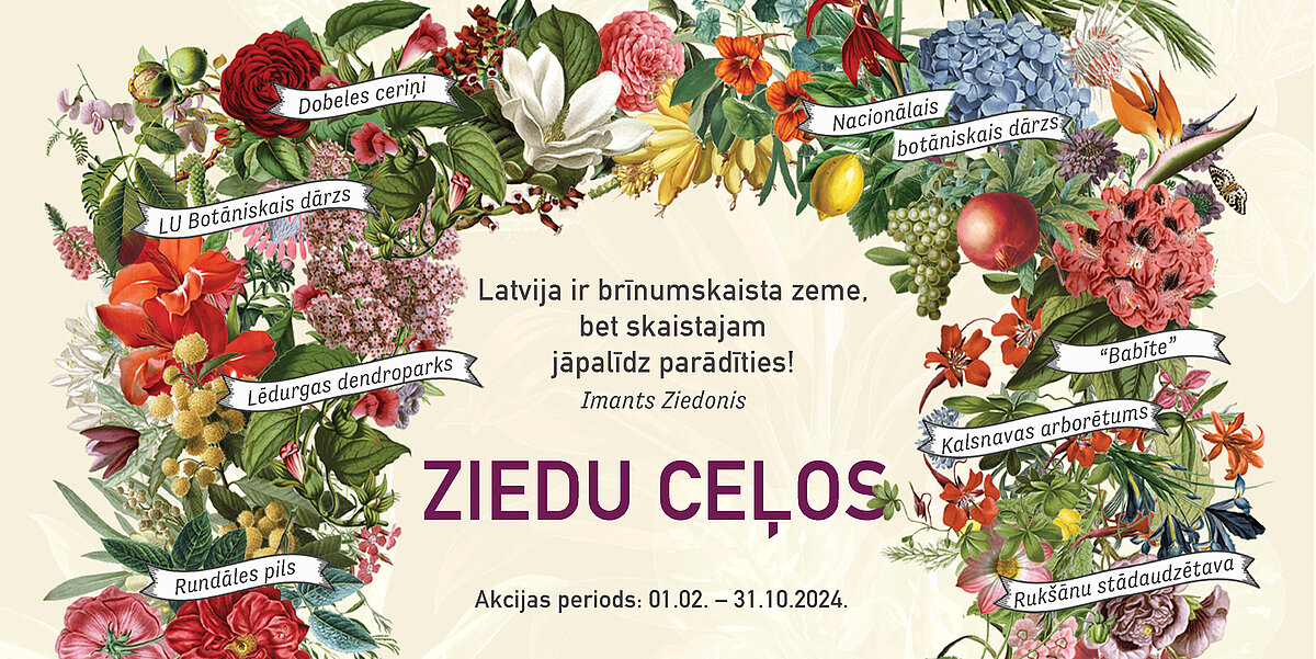 Apceļo astoņas ziedošās kolekcijas, krāj zīmodziņus un iepriecini sevi ar kādu pārsteiguma balvu, ko sarūpējuši dārzi! Akcija “Ziedu ceļos” šajā gadā ilgst no 1. februāra līdz 31. oktobrim. „Latvija ir brīnumskaista zeme, bet skaistajam jāpalīdz parādīties”, sacījis Imants Ziedonis, ar kura dzejas rindām jau 14. februārī aicināsim uz pirmo tematisko norisi LU Botāniskajā dārzā.